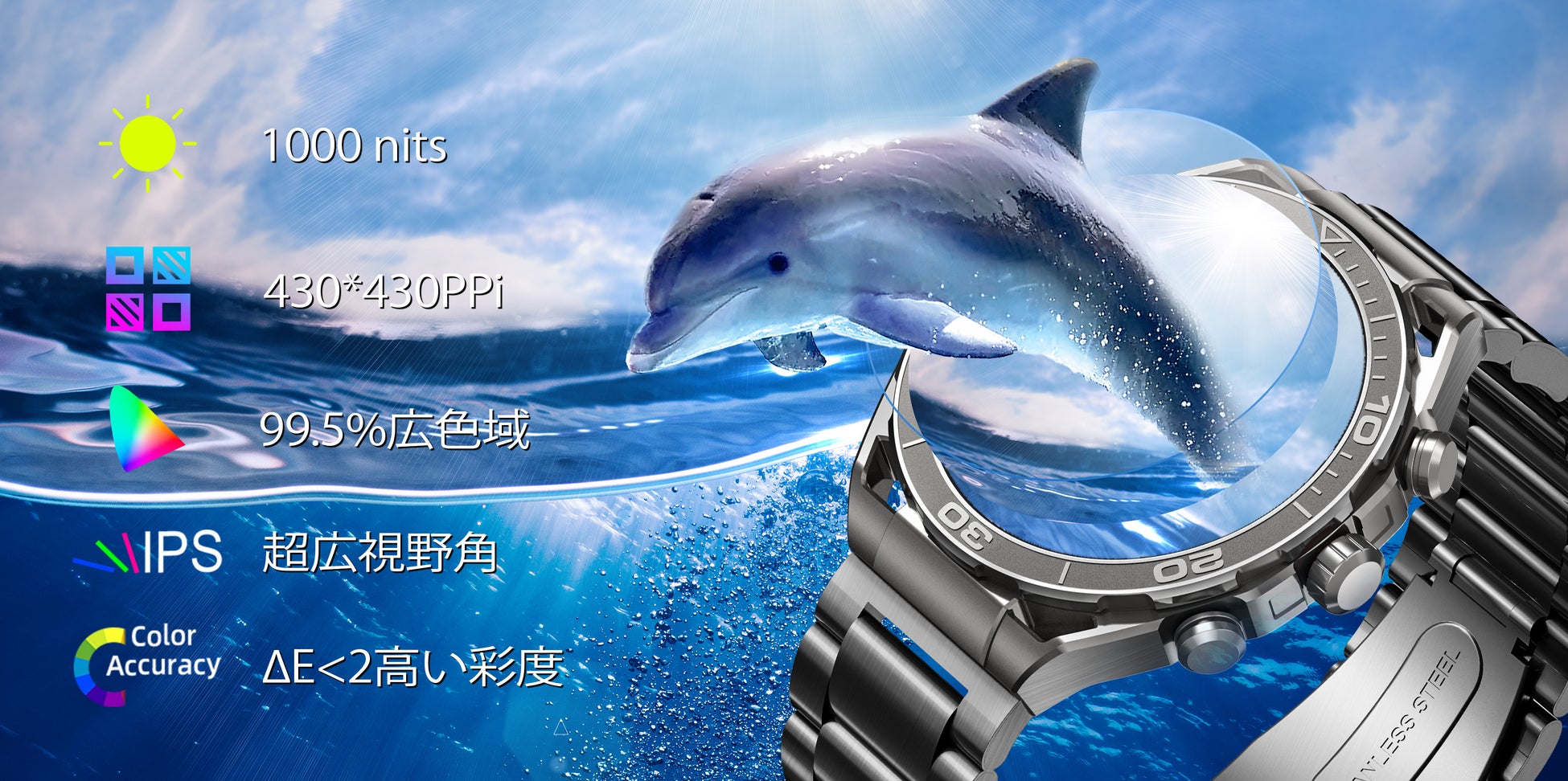 1. 430*430解像度の1.52インチ全画面で、 HDタッチサゴリラガラススクリーン、洗練されたCNS切削亜鉛合金ボディ、回転式リューズです。手触りがよく柔らかい液状シリコーンベルトと耐久性に優れた金属製ベルトの組み合わせで、オフィスシーンから、プライベート、デート、スポーツシーンまで幅広く合わせシンプルなデザインです。