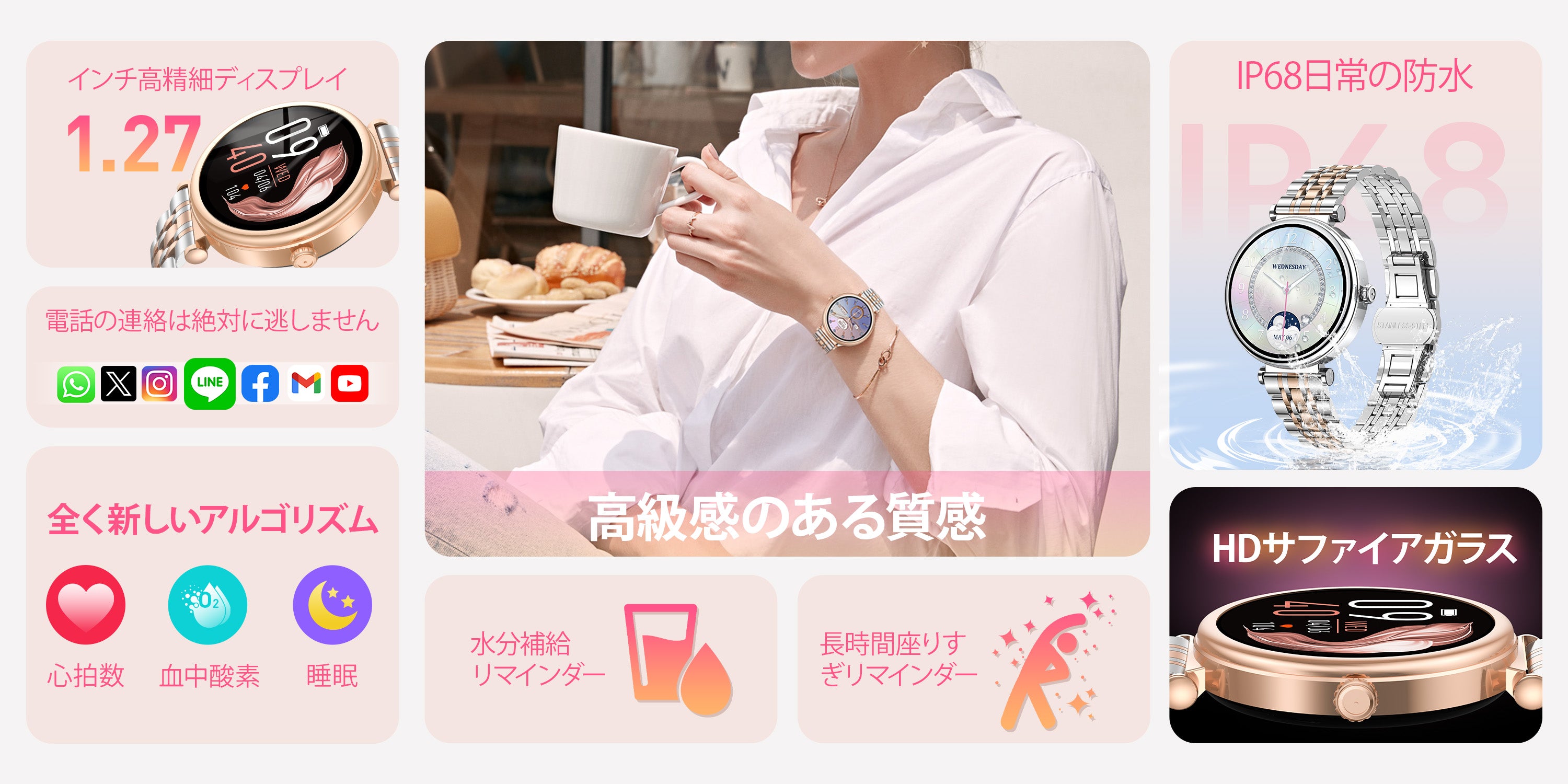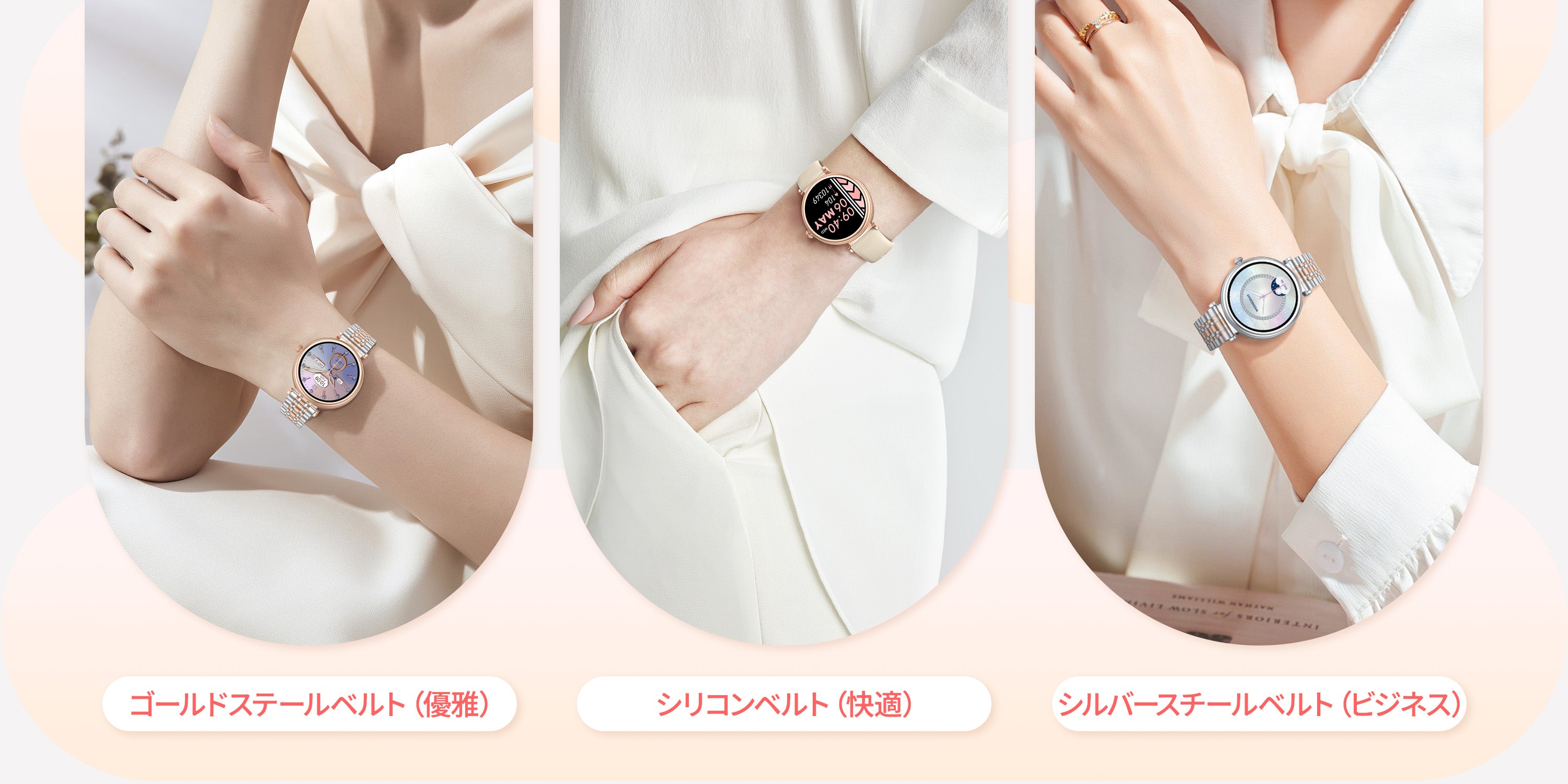 - 【超軽量設計で旅行やアウトドアにも最適】FOSMET レディーススマートウォッチは、長時間着用しても負担にならない超軽量・スリムなボディを採用しています。1.27インチ(約32mm)のコンパクトなディスプレイは、一般的な直径45mm前後のスマートウォッチに比べてひとまわり小さく、女性の細い手首にも美しくフィット。手首に自然になじみ、付けていることを忘れるほど快適な装着感を実現します。見やすい画面と、情報がひと目で確認できるシンプルかつ鮮明な表示設計により、日常使いはもちろん、旅行やアウトドアなどのアクティブなシーンでも頼れるパートナーとして活躍。旅行中でもバッグからスマートフォンを取り出すことなく、通知や時間を簡単に確認できるので非常に便利です。