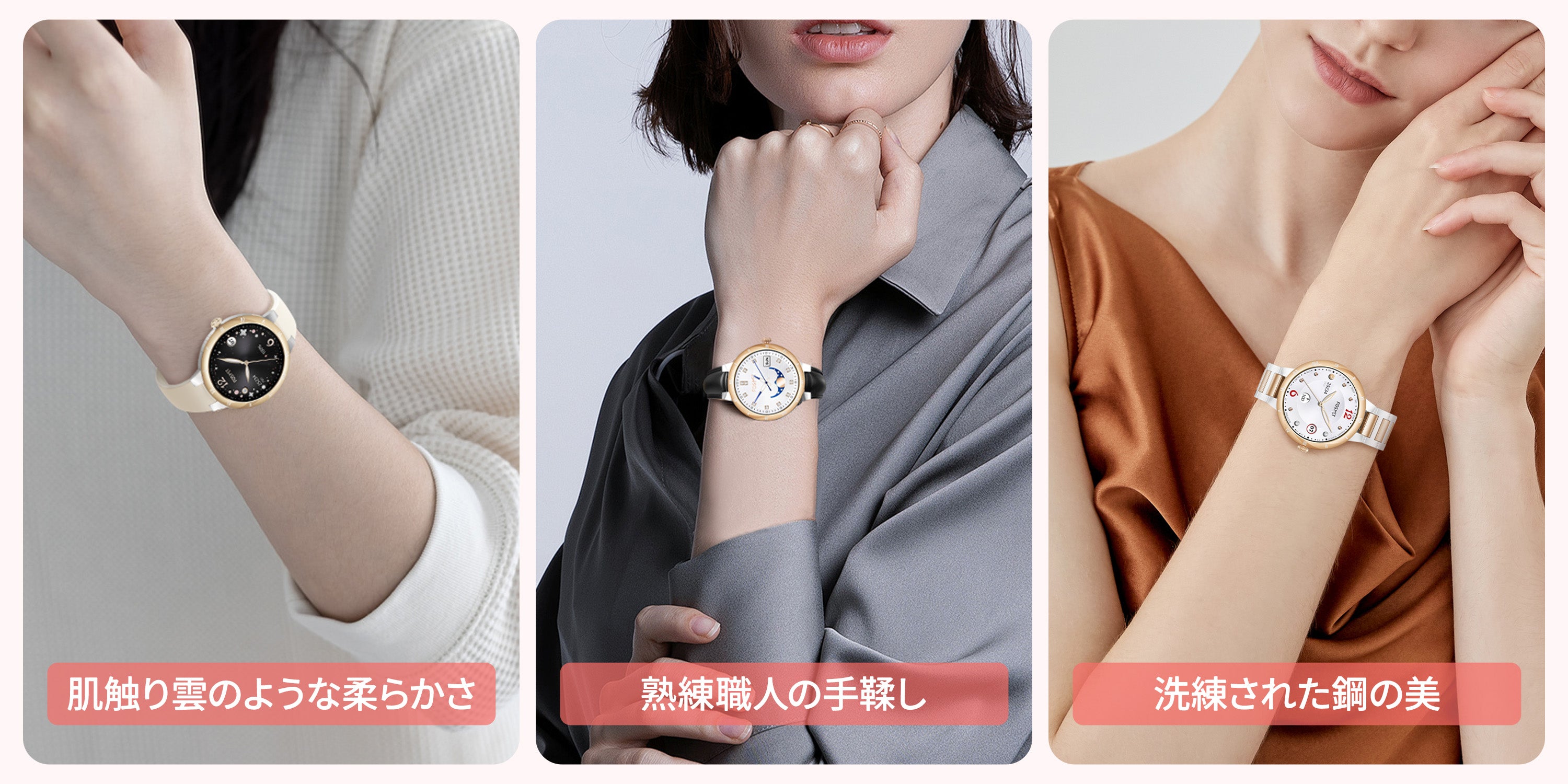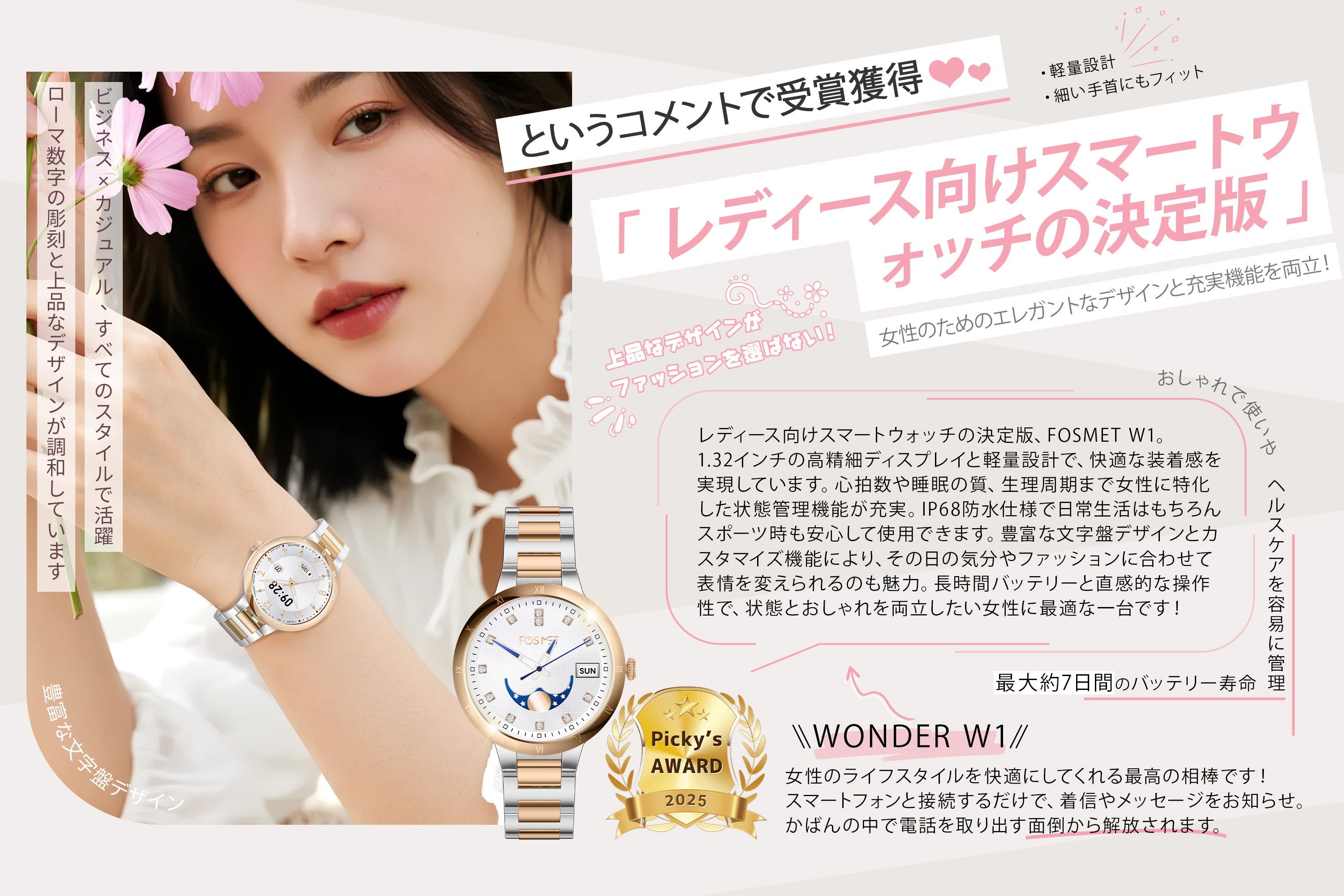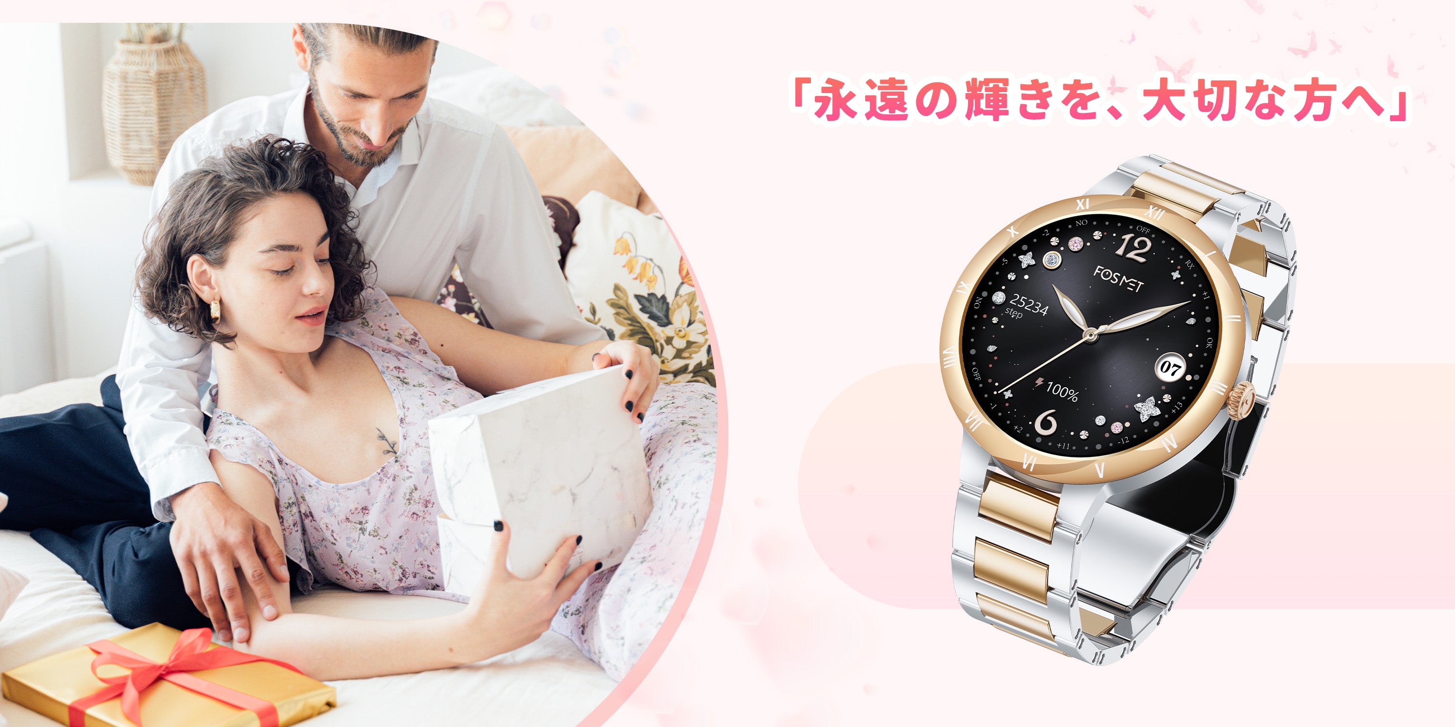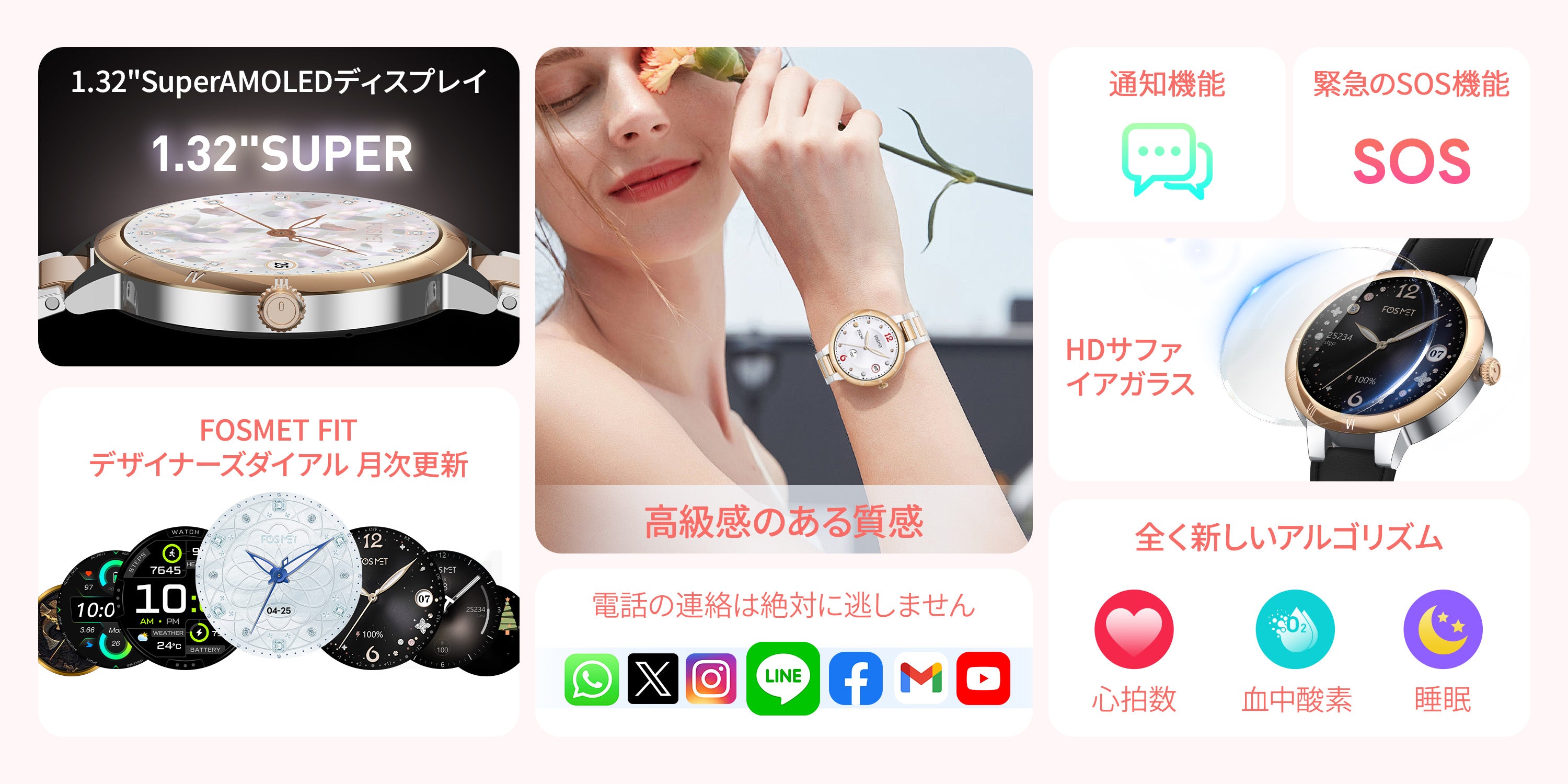 - 【サファイアガラス・AMOLED搭載&光沢カラーが特徴|アプリ利用に関する重要なお知らせ】FOSMET W1 スマートウォッチ レディースは、ゴールドとシルバーの高級感溢れるカラーに、ローマ数字が刻まれたベゼルが上品さを引き立て、女性の手首にフィットする1.32インチのサファイアディスプレイを採用により、よりエレガントでシンプルな小さめのスマートウォッチを実現しています。鮮やかなAMOLED画面は視認性に優れ、サファイアガラスは非常に滑らかで、心地よくスライド操作が可能。ベルトは2種類から簡単に交換できるので、初めてのレディース腕時計や日常使いにも最適です。シンプルで飽きのこない丸型デザインは、オフィスからカジュアルまで幅広いシーンで活躍します。 【ご購入前の重要なお知らせ】 現在、FOSMET FITアプリのAndroid版は、さらなる最適化・品質向上のため、一時的にストアから下架しております。そのため、初期設定およびご使用の際は、代替アプリ「GloryFitPro」を先にダウンロードしてご利用ください。FOSMET FITアプリのAndroid版は、改善作業完了後に再公開予定です。
