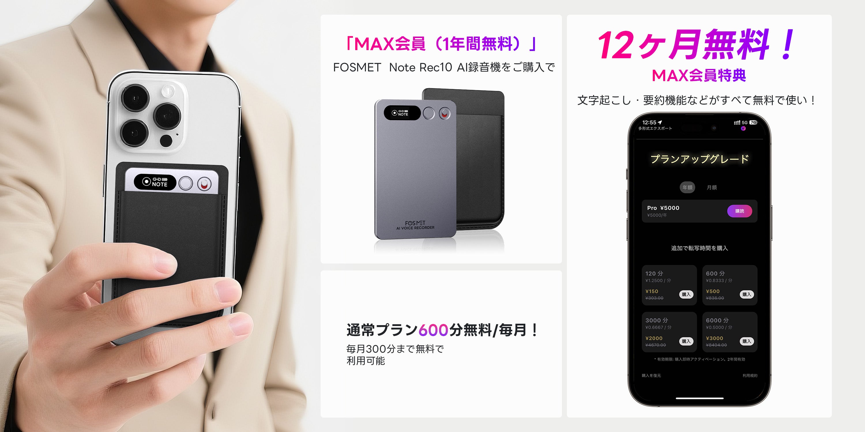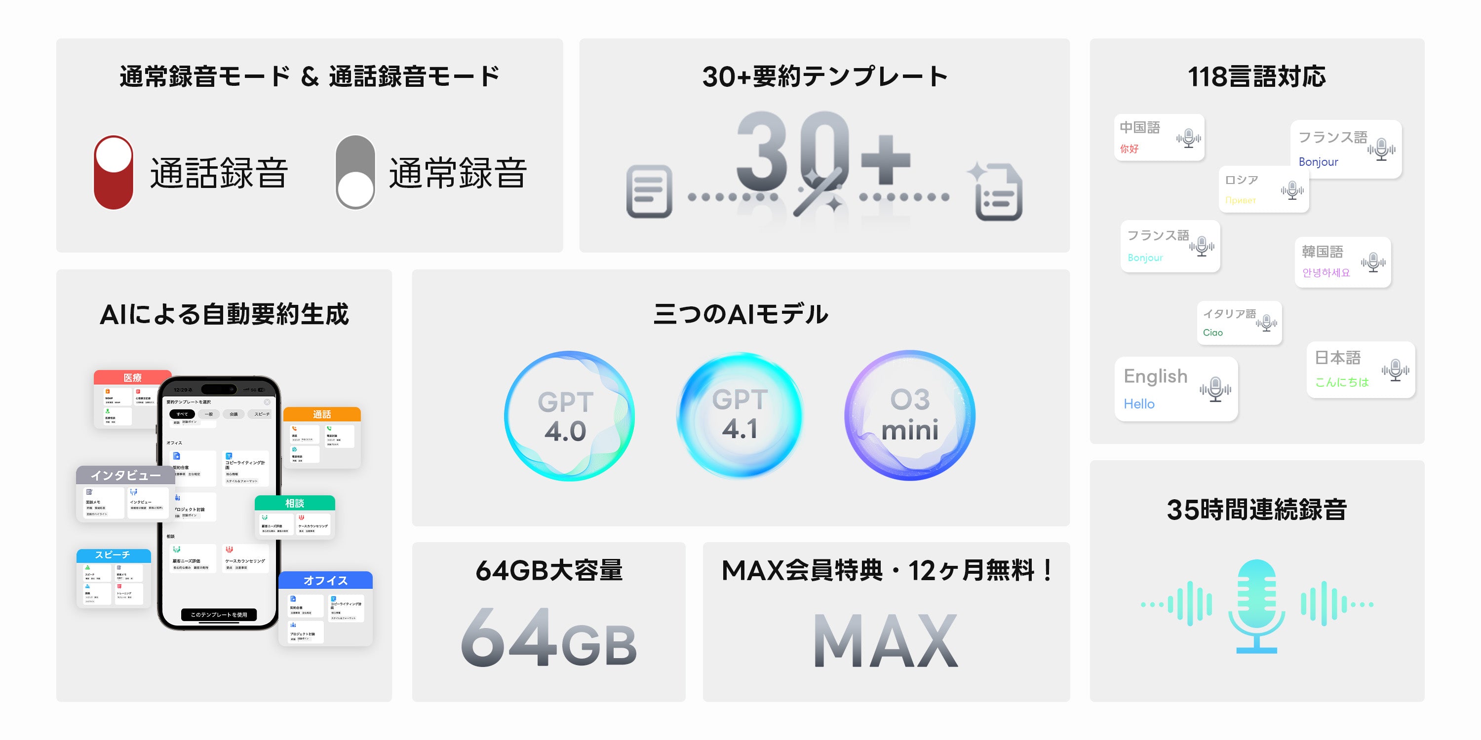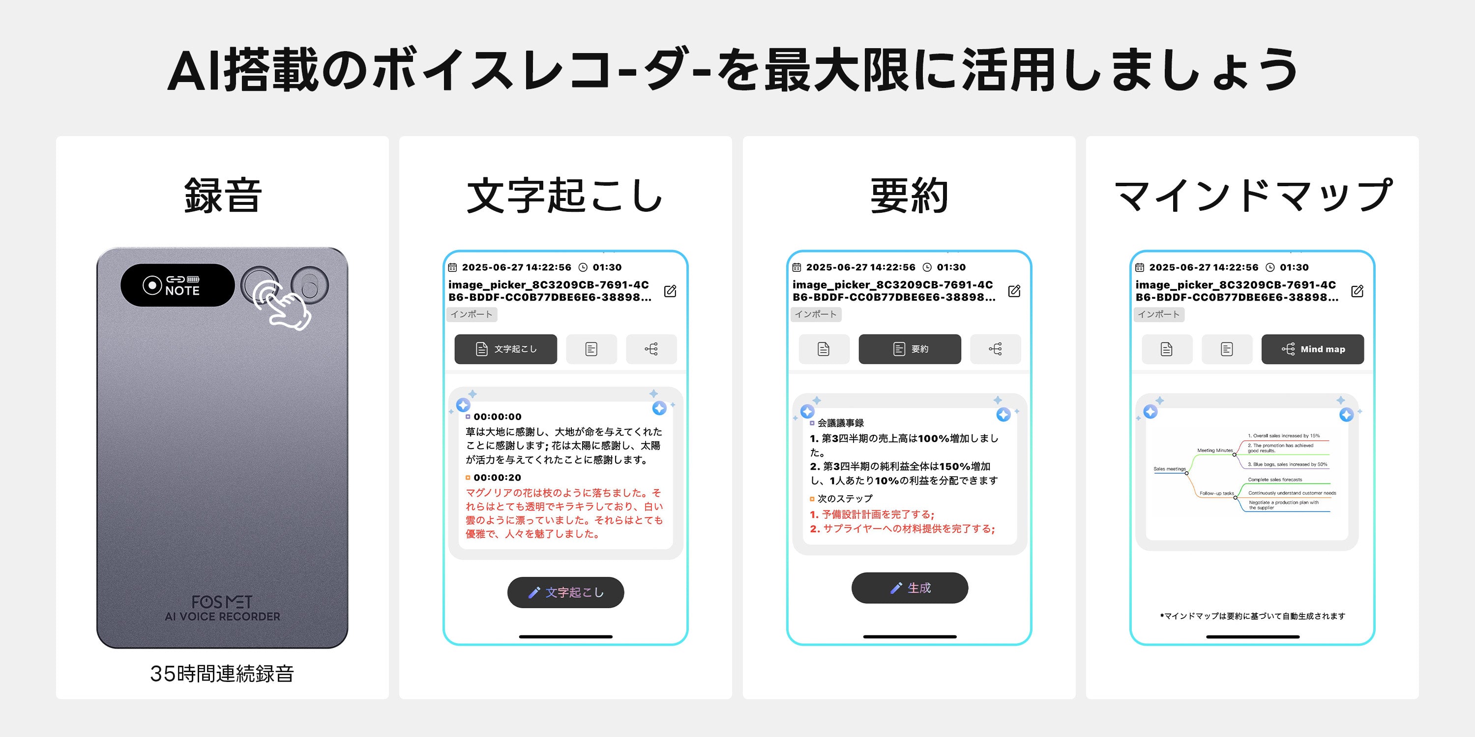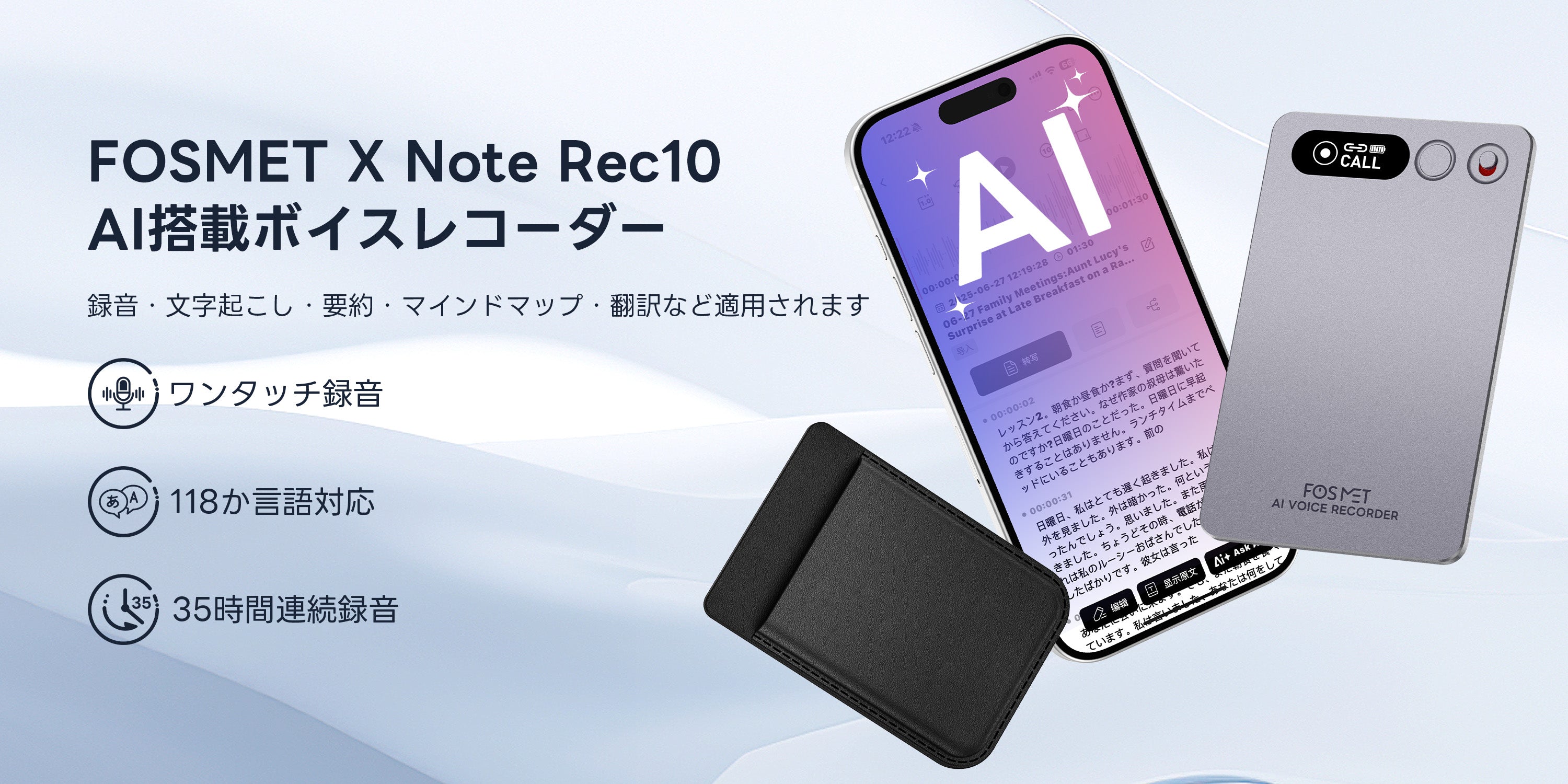商品の追加説明 : FOSMETXNote Rec10 AIボイスレコーダー 自動文字起こし/要約/マインドマップ 35時間連続使用 30種以上のテンプレート GPT-4.0/GPT-4.1/O3-mini三つのAIモデル搭載 ワンタッチ録音 118言語対応 64GB大容量 発言者識別 Bluetooth接続 通常・通話録音モード スマホとPC対応 会議/授業/インタービューなどに適用 TELEC認証済み